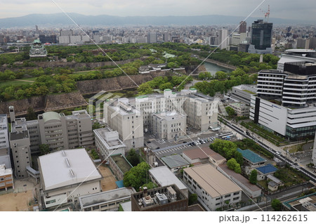 大阪城を望む春の長雨、四月、タワーマンションのラウンジより大阪城公園を望む