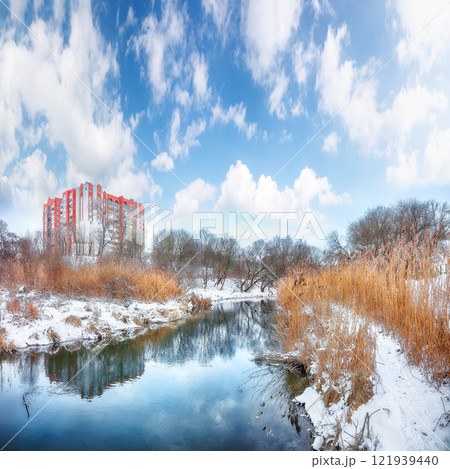 Outstanding landscape in city park with snowy trees and beautiful frozen river.