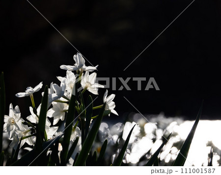 冬の朝日を浴びて水辺で輝く純白のスイセン【ペーパーホワイト】