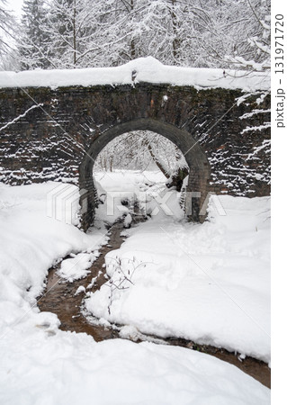 A serene view showcases a stone arch bridge surrounded by untouched snow, spanning a gentle stream under a backdrop of trees.