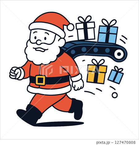 Santa Claus running with gifts on conveyor belt, spreading holiday cheer and excitement
