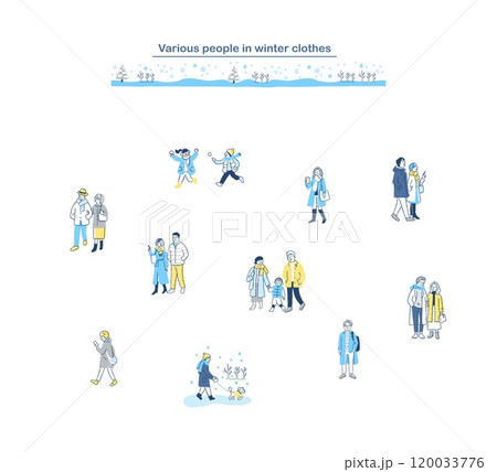冬服を着て笑顔で歩く人々、家族、テクスチャのあるかわいい手描きイラストセット