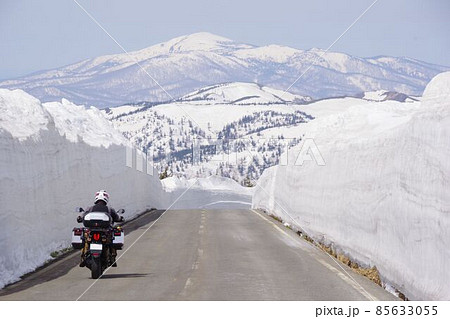 春のツーリングイメージ 八幡平の雪の回廊を走るバイク