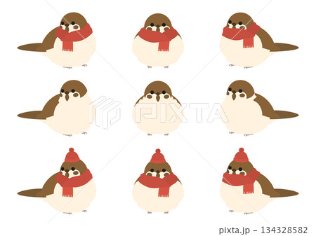 冬に丸くふくらんだスズメのかわいいベクターイラストセット(マフラー・ニット帽)
