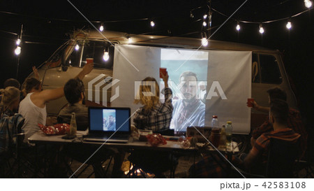 Multi ethnic group of women relax together during summer travel inside the camper van