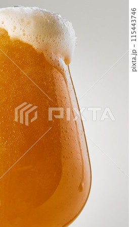 Cropped, close-up of shaped glass filled with a golden, carbonated beer with thick, creamy foam cascades over rim.