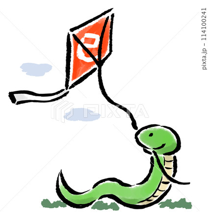 凧揚げをする巳(へび) 筆タッチ手描きイラスト