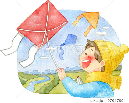 河川敷で凧あげをする子どものイラスト(背景付き)
