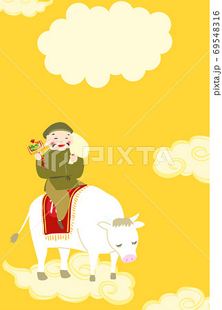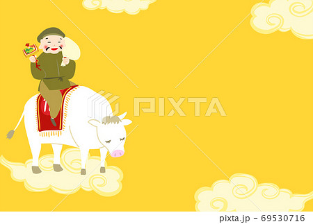 白い牛に乗った七福神・大黒天の年賀状イラス