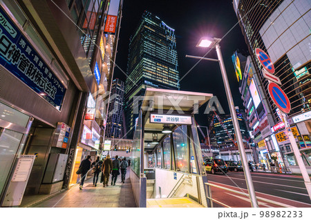 日本の東京都市景観 夜の渋谷駅(出入口B3)などを望む。奥は銀座線渋谷駅や渋谷スクランブルスクエア