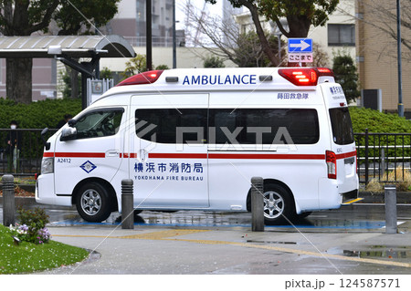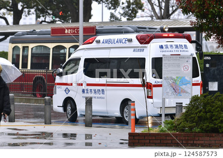 日本の横浜都市景観 逆戻り…4月なのに冬の寒さに…桜木町駅前に出動した救急車=4月1日