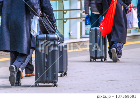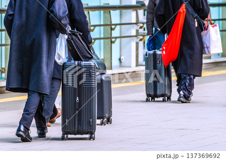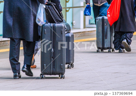 日本の横浜都市景観新横浜駅前のペデストリアンデッキを移動するスーツケースの人々