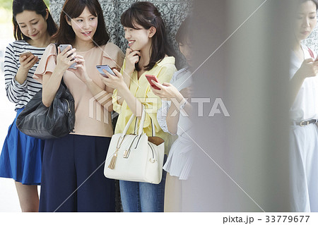 とまり木にとまった有名人の写真をスマホで撮る女性たち