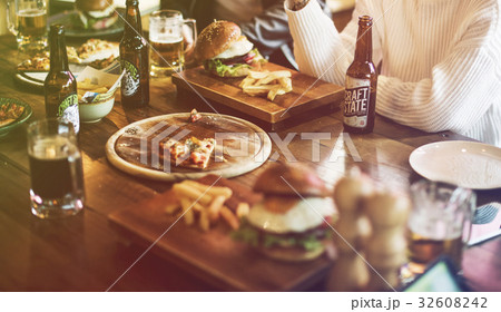Fast food pizza and burgers on wooden table