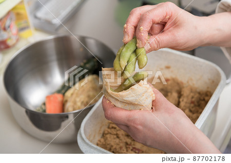 【出汁パックに入れて漬けた枝豆を糠床から取り出す】
