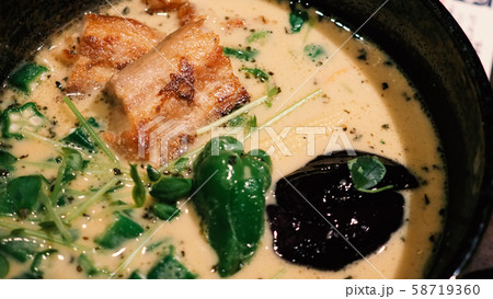 Close-up images of yellow color soup curry with chicken, pork and vegetable in bowl which famous traditional food menu and only found in Hokkaido Sapporo district of Japan