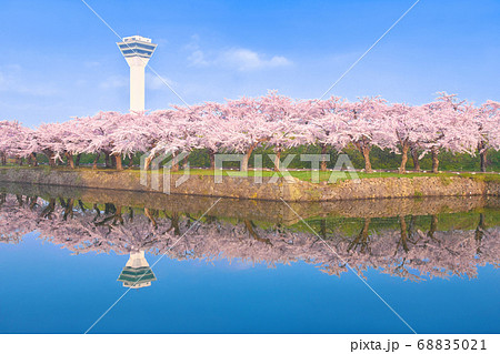 北海道函館市 五稜郭公園の桜の鏡面反射