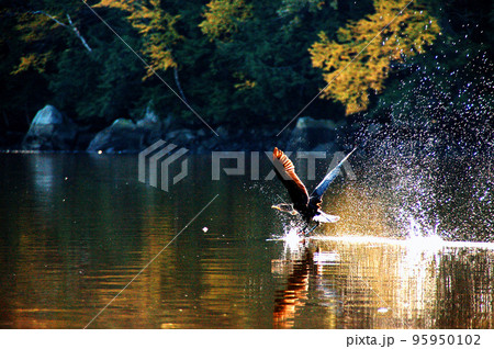 ニューイングランド ランプレイ川を飛び立つカワウと水飛沫
