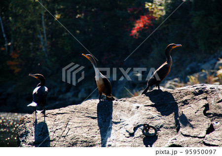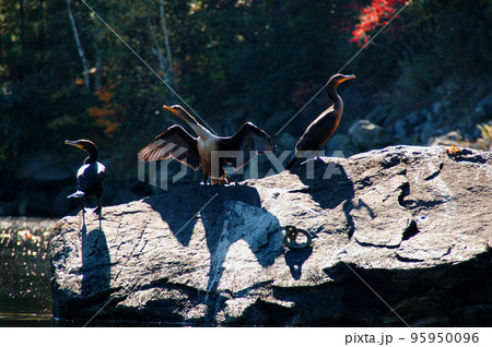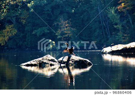 ニューイングランド ランプレイ川の岩上で羽を休めるカワウ