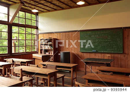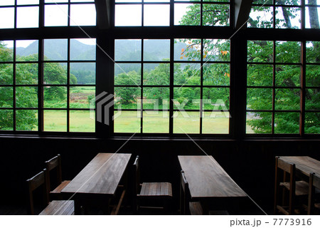 懐かしい 小学校校舎 教室 机と椅子 校舎 窓ガラス