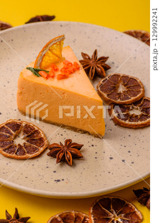 A slice of yellow cheesecake cake flavored with lemon and passion fruit