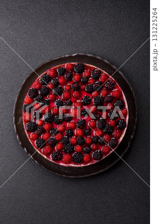 Pie, cheesecake with raspberries and blackberries, mascarpone cheese. Piece of cheesecake