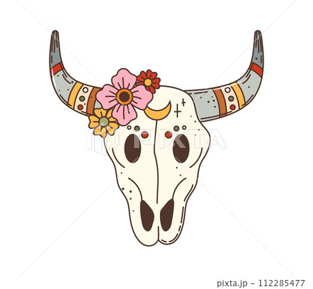 Wild west cow skull western groovy item. Isolated vector decorated bull dead skeleton head, rustic decor, embodying the rugged spirit of the frontier with intricate boho style symbols and flowers