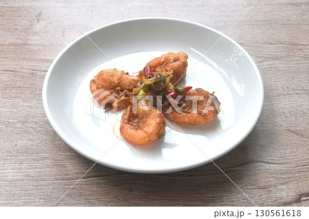 deep fried salty river shrimp with chop garlic and chili pepper arranging on plate