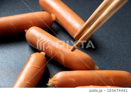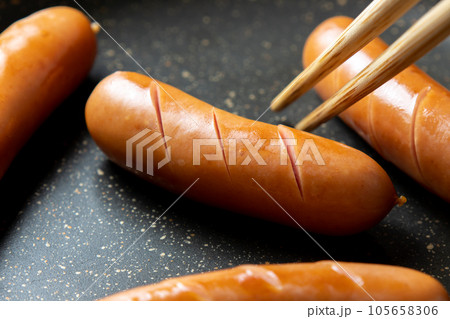 ウインナーソーセージに切れ込みを入れてフライパンで焼く調理シーン。