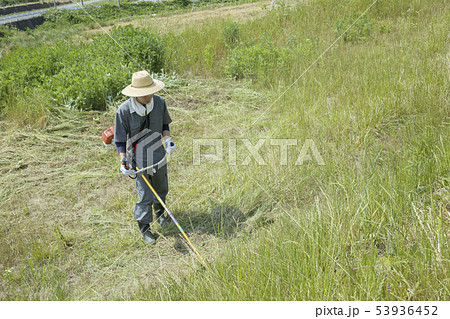 草刈り、除草イメージ 草刈り機をする男性顔なし後ろ姿