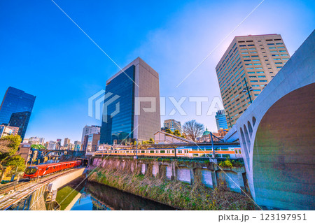 日本の東京都市景観 四ツ谷駅を出発した東京メトロ丸ノ内線新型車両2000系などを望む(C)