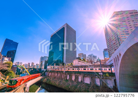 日本の東京都市景観 珍景。丸ノ内線2000系や御茶ノ水駅、桜などを望む。水面には花筏が広がる