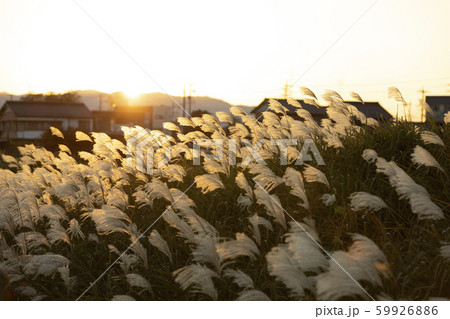 秋の夕暮れにすすきがなびく 散歩道にすすきが群生