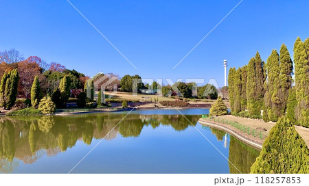 青空と紅葉の水鏡〈あいち健康の森公園(さんさん広場・いのちの池)/愛知県大府市〉