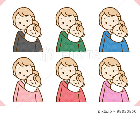 お宮参りの産着をつけた親子のイラスト素材セット赤い着物