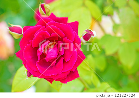 家の周りの草花 四季の色々 バラ園 美しい可憐な花びら 初秋のかぜに揺れる妖艶な赤いバラ