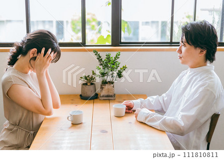 カフェ・家のダイニングで別れ話・深刻な話をする男性とショックを受ける女性