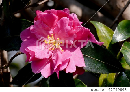 三鷹中原に咲くピンクのツバキ(カンツバキ)の花