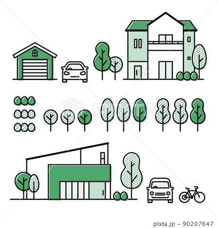郊外の一軒家、植木、自動車、自転車、ガレージのアイコンセット