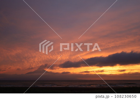 日本最大の高層湿原、北海道の利尻礼文サロベツ国立公園、サロベツの原野で洋上の利尻島を眺める、その夕日