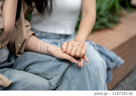 A caring woman holding her sad friend's hand to offer comfort while they converse outdoors.