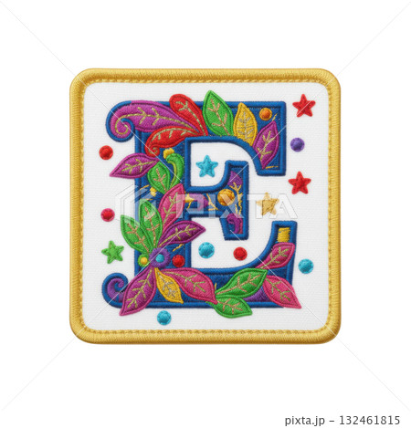 Colorful and festive embroidered patch of alphabet letter E. This joyful embroidery decoration has an ornate design with leaves, stars, and beads on cloth badge