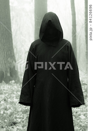 Death in a black hoodie mantle in forest mistery fog. Horror style fear spooky evil