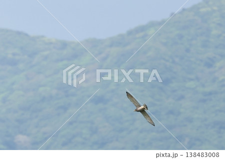 生き物 野鳥 サシバ、石垣島の山を背景に飛ぶ。胸が褐色で腹に横班、淡色型成鳥のオスでしょうか