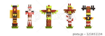 Totem Pole Monument Carved with Animal Figures Vector Set
