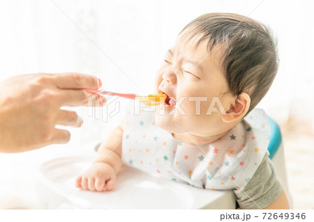 窓辺でベビーチェアに座って離乳食を食べる赤ちゃん