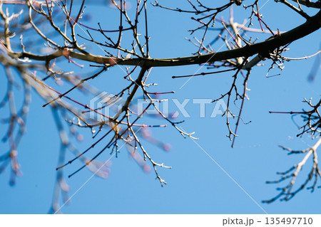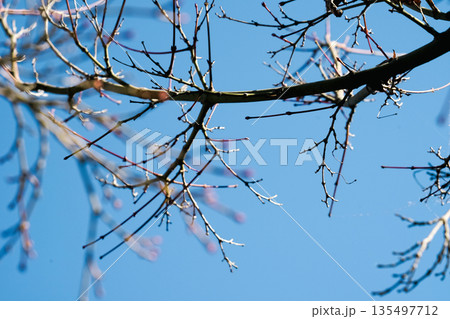 日本岡山後樂園仰望藍天下的櫻花樹枝與初春花苞,充滿生命力的自然特寫