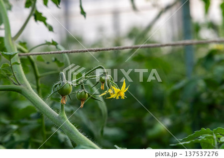 トマトの花と小さな実のクローズアップ