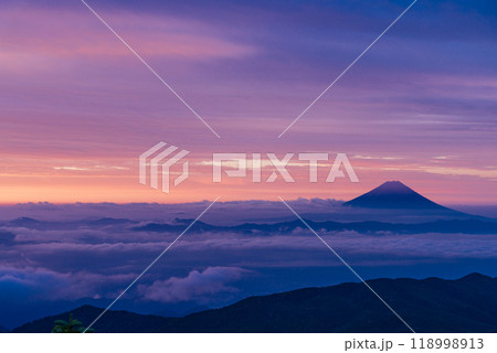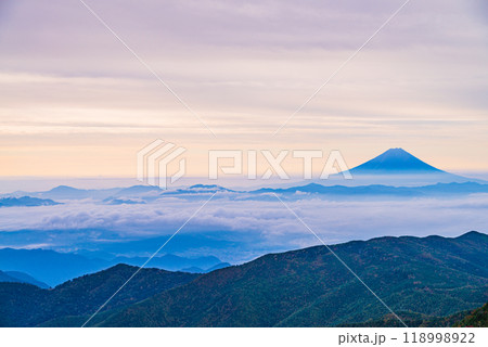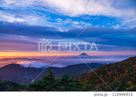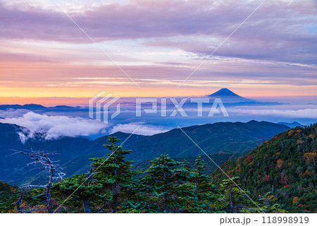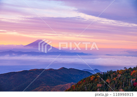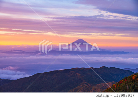 【山梨県】紅葉が始まった国師ヶ岳から望む富士山 夜明け