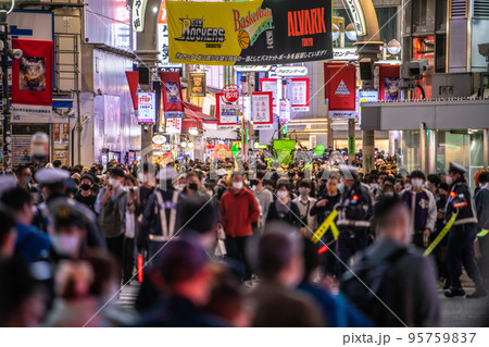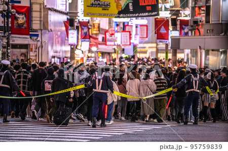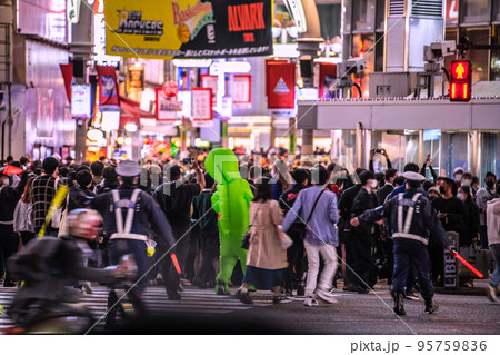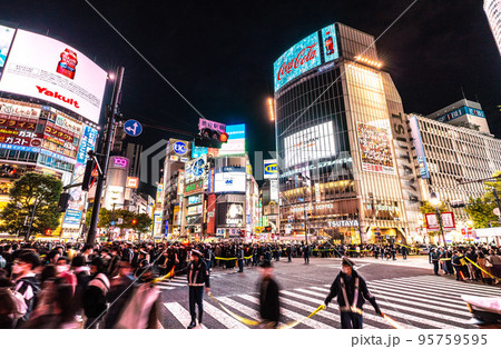 日本の東京都市景観 ハロ前夜。渋谷はハロウィン本番さながらのカオス。警察官も出動…=10月30日
